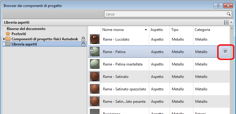 È possibile sostituire un componente esistente con un altro selezionato nel Browser dei componenti di progetto. Il materiale acquisisce le proprietà del nuovo componente di progetto.