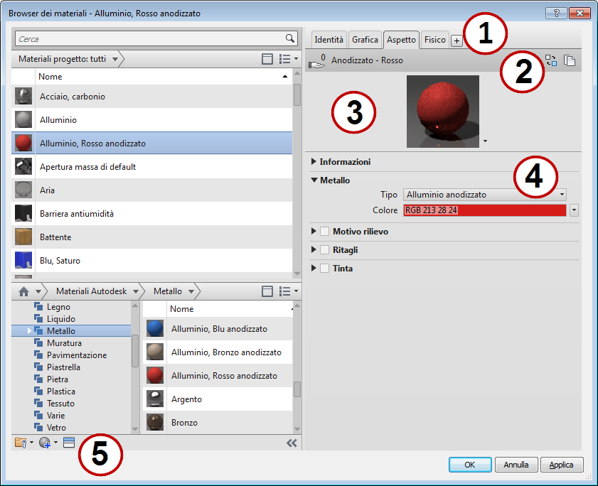| 4 | Riquadro Proprietà: consente di visualizzare e gestire le proprietà dettagliate del componente di progetto selezionato. Il nome e la descrizione del componente di progetto sono disponibili al di sotto del riquadro delle informazioni. L'esempio visualizzato sopra mostra le proprietà Metallo espanse per il componente di progetto Anodizzato - Rosso. |