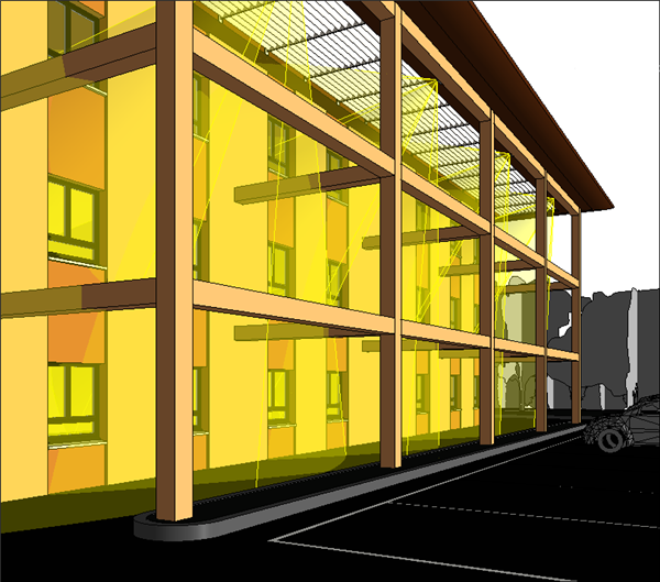 Una dei scopi più comuni del rendering di un'immagine è la verifica dell'effetto dell'illuminazione sul modello di edificio. Ad esempio, si supponga di voler illuminare in modo uniforme la facciata di un edificio. Dopo avere posizionato i dispositivi di illuminazione, verificare che le luci producano il risultato desiderato.