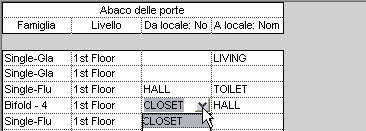 Viene visualizzato l'abaco delle porte. Poiché i campi A locale e Da locale non vengono aggiornati automaticamente con le modifiche apportate alla direzione di apertura delle porte già posizionate, è possibile modificare questi campi selezionando un valore dall'elenco.
