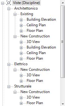 Ad esempio, nell'immagine seguente vengono mostrate le viste nel Browser di progetto organizzate per disciplina, quindi per fase e infine per tipo di vista. Il livello superiore del ramo Viste mostra inoltre il nome del gruppo di ordinamento correntemente applicato (in questo caso Disciplina).