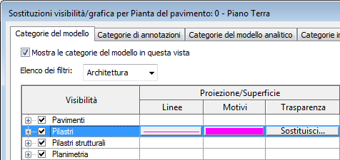 La maggior parte delle sostituzioni di visibilità e visualizzazione grafica viene eseguita nella finestra di dialogo Visibilità/Grafica. L'eccezione è rappresentata dalle sostituzioni per i singoli elementi, in quanto queste vengono eseguite nella finestra di dialogo Grafica elemento specifica della vista.