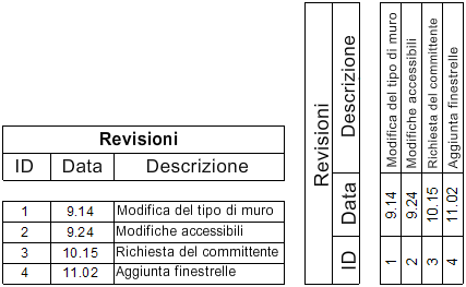È possibile ruotare un abaco delle revisioni di 90 gradi in senso orario o antiorario all'interno di un cartiglio. Per ruotare un abaco delle revisioni, occorre modificare la famiglia di cartigli. Non è consentito ruotare un abaco delle revisioni in una tavola di un progetto.