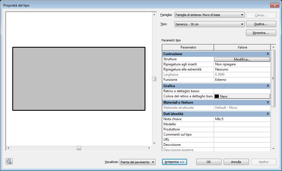 Di seguito è raffigurato un esempio di finestra di dialogo Proprietà del tipo relativa ad un tipo di muro, con il riquadro Anteprima visualizzato.