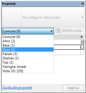 Immediatamente sotto il Selettore di tipo è disponibile un filtro per identificare la categoria degli elementi inseriti da uno strumento, oppure la categoria e il numero di elementi selezionati nell'area di disegno. Se sono state selezionate più categorie o tipi, nella tavolozza vengono visualizzate solo le proprietà comuni a tutte le istanze. Se sono selezionate più categorie, utilizzare l'elenco a discesa del filtro per visualizzare solo le proprietà relative ad una categoria specifica o alla vista stessa. La selezione di una categoria specifica non interessa l'intero gruppo di selezione.