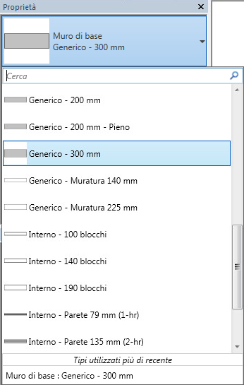Quando uno strumento per l'inserimento di elementi è attivo, o elementi dello stesso tipo sono selezionati nell'area di disegno, il Selettore di tipo viene visualizzato nella parte superiore della tavolozza Proprietà. Identifica il tipo di famiglia correntemente selezionato e fornisce un elenco a discesa dal quale è possibile selezionare un tipo diverso.