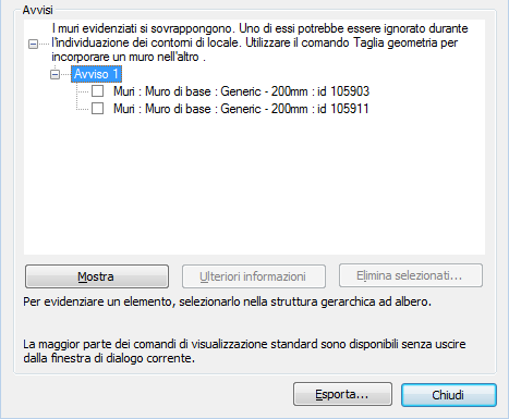 Espandere l'elenco per visualizzare i singoli elementi associati a ciascun avviso. Quando si seleziona il testo accanto all'avviso, l'elemento viene evidenziato in tutte le viste aperte in cui è visibile.