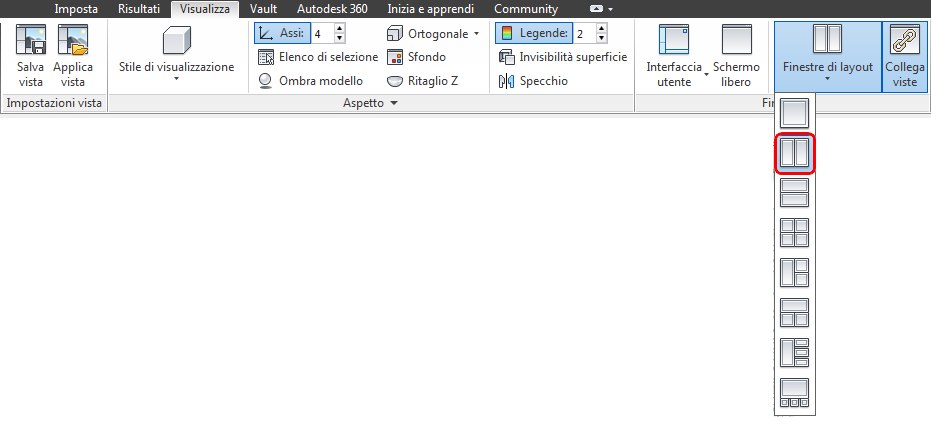 3. Dividere la vista in due finestre di layout. A tale scopo, fare clic su Visualizza (scheda) > Finestra (gruppo) > Finestre di layout. Selezionare l'opzione Viste divise (verticale):