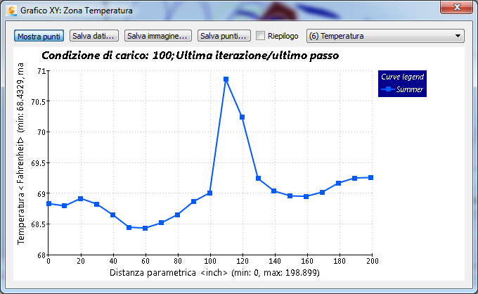 Nota: Come previsto, la curva di temperatura superiore è data dallo scenario Winter, mentre quella inferiore è data da Summer. Al centro della curva di Summer, vediamo un brusco aumento di temperatura (circa 2° F in 40 pollici). Ciò significa che la parte posteriore dell'occupante è un po' più fredda rispetto alla sua parte anteriore; questo potrebbe indicare una situazione di potenziale disagio.
