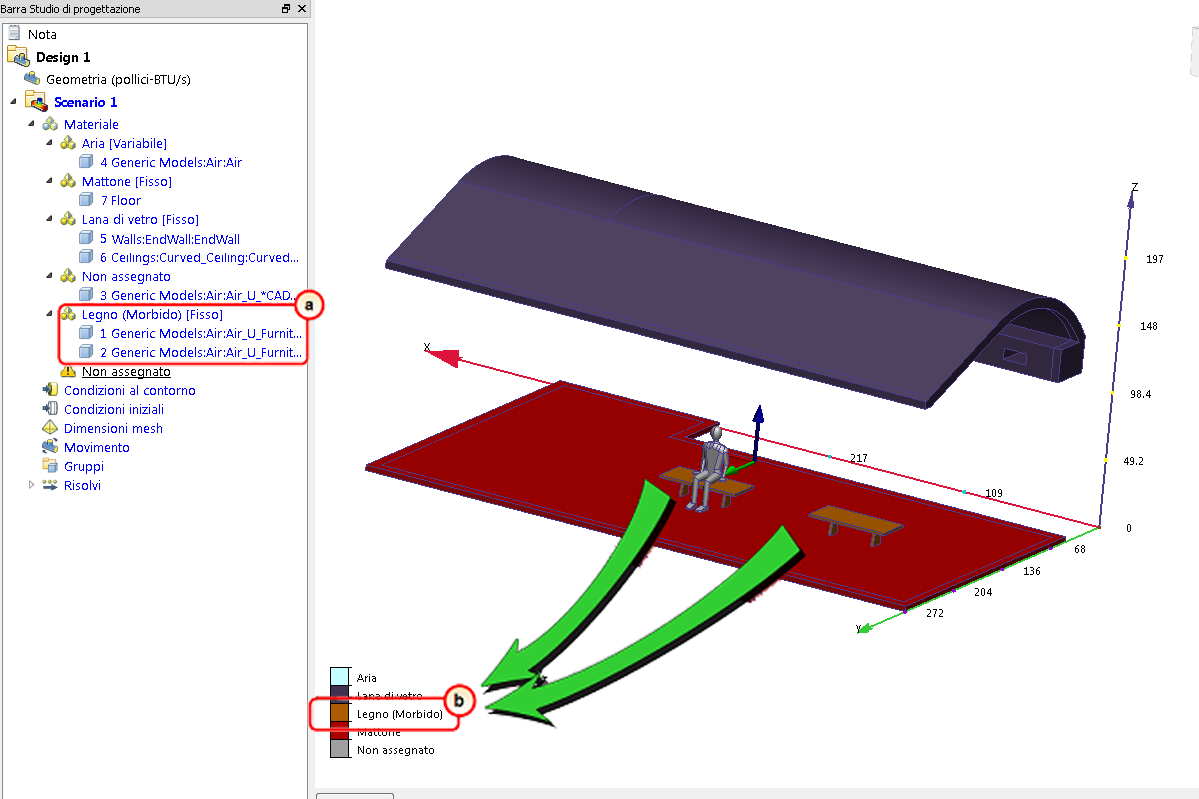 I due banchi nella sala esposizioni sono di legno, quindi in questo passaggio assegneremo loro il materiale Legno.