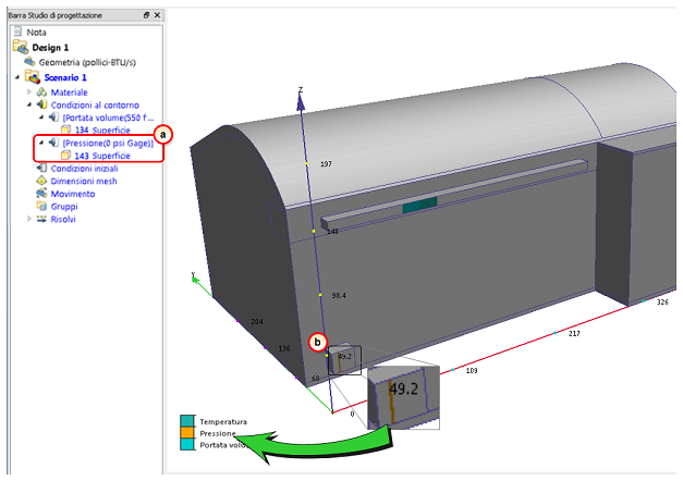 6. Per verificare che la condizione al contorno sia applicata correttamente al ritorno, verificare la barra Studio di progettazione e le strisce di colore sulla superficie di ritorno: