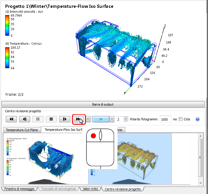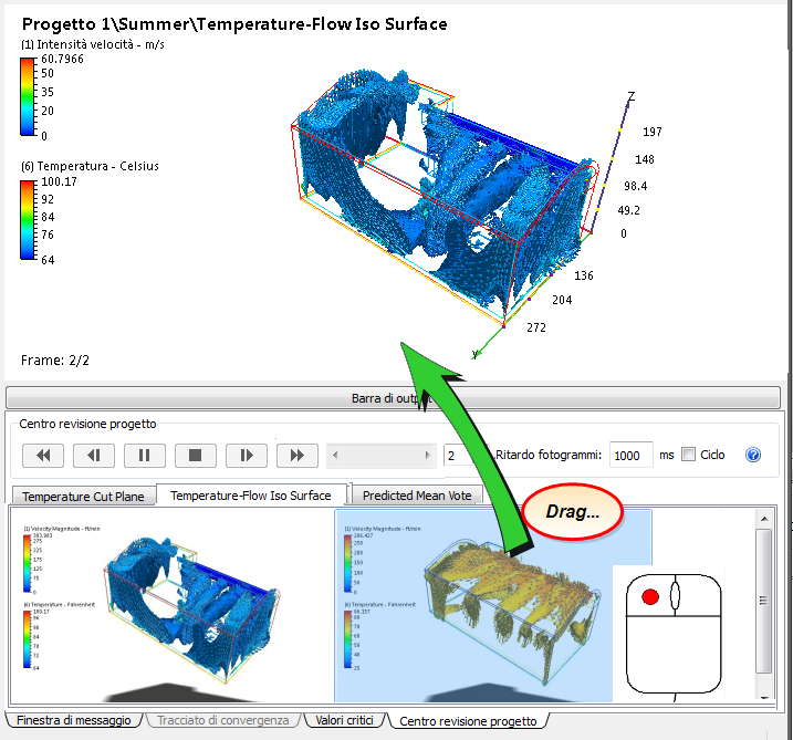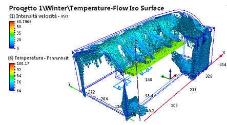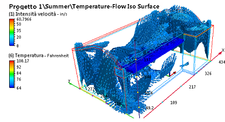Nella fase precedente è stata analizzata la temperatura nella parte centrale della sala, riscontrando differenze significative tra gli scenari Summer e Winter. In questa fase utilizzeremo l'immagine di riepilogo delle isosuperfici per studiare l'interazione tra flusso e temperatura.