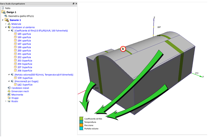 15. Per verificare che la condizione al contorno del coefficiente di film sia applicata correttamente alle superfici esterne, controllare la barra Studio di progettazione e la striscia colorata sulle superfici: