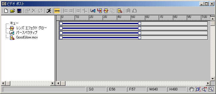 このキューの場合も、すべて正しいイベントが使用されています。しかし、問題は、キュー内でのイベントの順序にあります。この問題のよくある原因は、イベントが選択されている状態で、他のイベントを追加したことです。この場合は、パース イベントが選択された状態で、レンズ エフェクト グロー イベントと出力イベントを追加しました。
