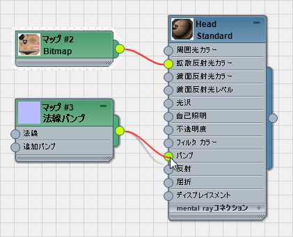 - 新しいビットマップ ノードから Head マテリアルの[拡散反射光カラー](Diffuse Color)コンポーネントにワイヤリングします。