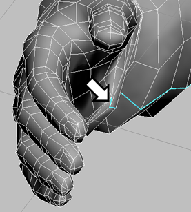 はじめに、縫い目の設定は、既に設定した名前付きポリゴン選択内でのみ行う必要があります。ここでは、各腕の下側の縫い目と、胴体と脚のクラスタの 2 つの縫い目(上着の背中とパンツの股下に 1 つずつ)を作成します。胴体と脚の 2 つの縫い目は、パンツの股の部分で結合します。