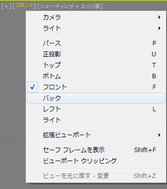 ([ビューポート最大化切り替え](Maximize Viewport Toggle))をクリックして、4 ビューポート レイアウトに切り替えます。フロント ビューポートをアクティブにし、POV (Point-Of-View、視点)ビューポート ラベル メニューをクリックして[バック](Back)を選択し、もう一度