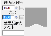 - [マテリアル パラメータ](Material Parameters)ロールアウトで、[鏡面反射光](Specular)と[光沢](Glossy)の値をどちらも同じ 15.0 に変更します。