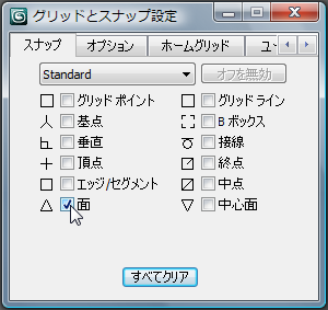 ([スナップ切り替え](Snaps Toggle))を右クリックし、[グリッドとスナップ設定](Grid And Snap Settings)ダイアログ ボックスを開きます。ダイアログ ボックスで、[すべてクリア](Clear All)をクリックし、[面](Face)をクリックしてオンにします。