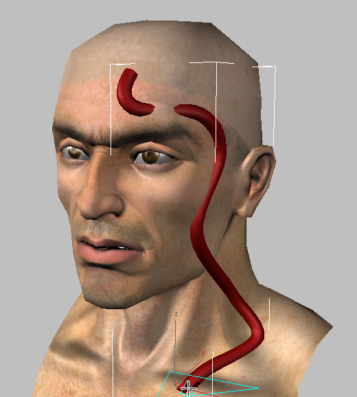 - 頭の左側に、頭頂部から肩に向かって、最初のスプラインを描画します。右クリックでスプラインの作成を終了します。