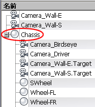 この Chassis オブジェクトは、4 つの車輪と 1 つのハンドルを子に持ちます。自動車の 3D モデルの典型的な階層構造です。