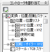 - [コントローラを割り当て](Assign Controller)ロールアウトのトラック リストで[回転 : オイラー XYZ](Rotation: Euler XYZ)をクリックしてから、