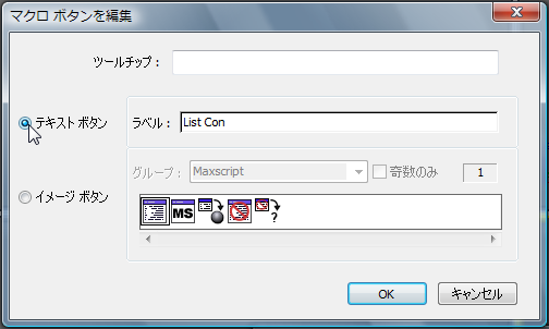 - [マクロ ボタンを編集](Edit Macro Button)ダイアログ ボックスで[テキスト ボタン](Text Button)オプションをオンにし、[ラベル](Label)フィールドに ListCon と入力して[OK]をクリックします。