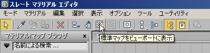 ([シェーディング マテリアルをビューポートに表示](Show Shaded Material in Viewport))をクリックしてオンにします(Direct3D、OpenGL、または Software のビュ-ポ-ト ドライバを使用する場合は、ツールチップに[標準マップをビューポートに表示](Show Standard Map in Viewport)と表示されます)。