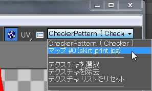 上部ツールバーで、テクスチャのドロップダウン リストを開き、[Map#0 (skirt_print.jpg)]を選択します(マップの番号は異なる場合があります)。