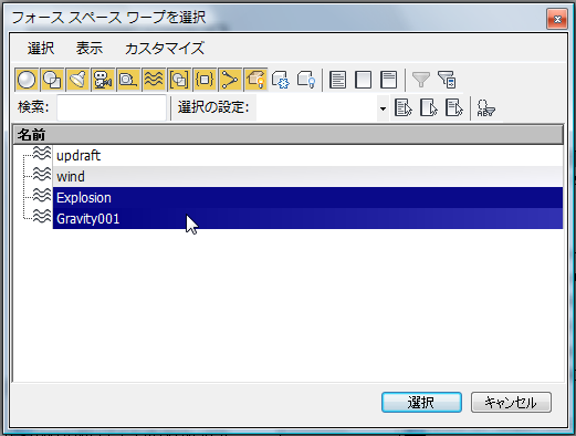 - [フォース スペース ワープを選択](Select Force Space Warps)ダイアログ ボックスで、Explosion スペースワープと Gravity001 スペースワープを Ctrl+クリックして選択し、[選択](Select)をクリックします。