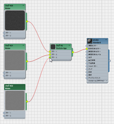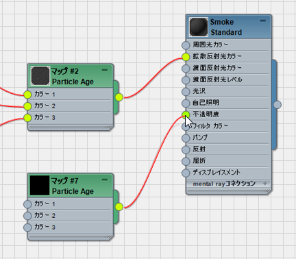- この新しいパーティクル エージ マップを Smoke マテリアルの[不透明度](Opacity)コンポーネントにワイヤリングします。