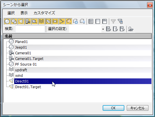 - [シーンから選択](Select From Scene)ダイアログ ボックスで、Direct01 をクリックしてハイライト表示し、[OK]をクリックします。
