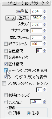 - [シミュレーション パラメータ](Simulation Parameters)ロールアウトで、[重力](Gravity)をオフにして、[ソーイング スプリングを使用](Use Sewing Springs)もオフにします。