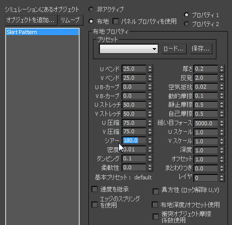 - [布地 プロパティ](Cloth Properties)領域で[U ストレッチ](U Stretch)の値を 50.0 に変更します(これによって[V ストレッチ](V Stretch)の値も変化します)。[シアー](Shear)の値を 180.0 に変更します。その他の布地の設定は変更しません。