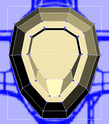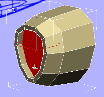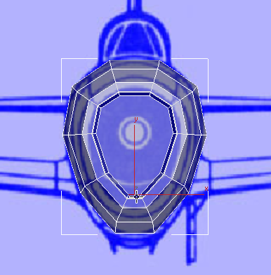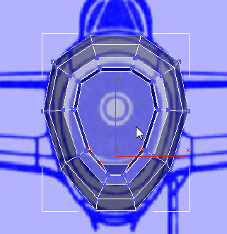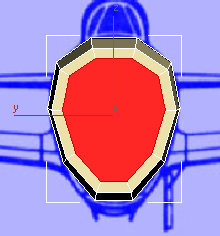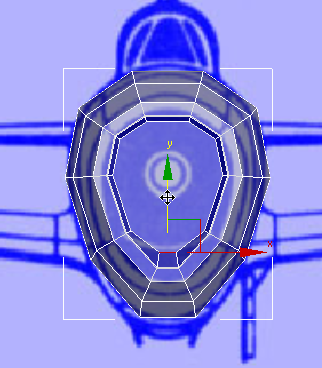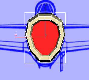 この時点で、飛行機の前面はほぼ完成しています。ただし、3ds Max での、このモデルの元になっている円筒を構築した方法が原因で、エアインテークの面が 10 辺のポリゴンになっています。前述のとおり、一貫した四角形のポリゴンで構成されたメッシュを使用することをお勧めします。このようなメッシュを使用すると、スムージングやスキンの変形(キャラクタを作成する場合)を行うときにはるかに作業がしやすくなります。そこで、大きな 10 辺のポリゴンを小さな四角形のポリゴンに分割して、エアインテークを完成させます。