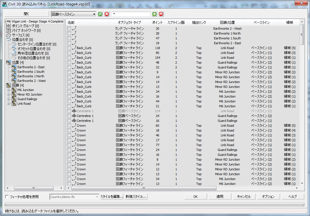 フィーチャ処理は、オブジェクトの読み込み時に、それらに定義済み Civil View オブジェクト作成スタイルを関連付けます。 フィーチャ処理スタイルから参照可能なスタイル定義の範囲には、次のものが含まれます。