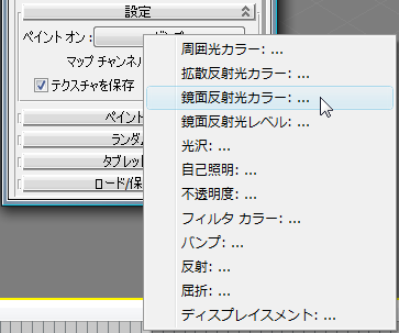 オブジェクトのマテリアル内の、ペイントするマップ タイプを選択します。ボタンをクリックすると、使用可能なマップ タイプのリストが表示されます。