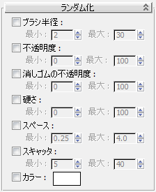 オンの場合、ブラシが適用されるたびに(継続したストローク内を含む)、ブラシのスペースが[最小](Min)と[最大](Max)の値の間でランダム化されます。