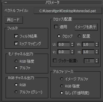 不透明度や鏡面反射光レベルなどのパラメータは単一値で、3 つの値を持つマテリアルのカラー コンポーネントとは異なります。この領域のコントロールによって、入力されたベクトル ファイルに対して出力のモノ チャネルのソースを指定します。
