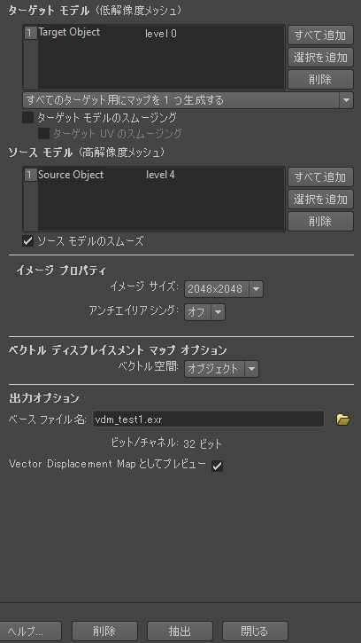 [ベクトル ディスプレイスメント](Vector Displacement) を順に選択します。 [テクスチャ マップを抽出](Extract Texture Maps)ダイアログが開きます。