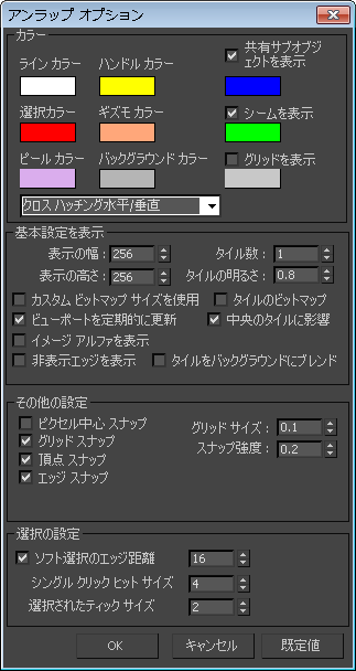 [アンラップ オプション](Unwrap Options)ダイアログ ボックスのコントロールを使って、[UVW アンラップ](Unwrap UVW)モディファイヤ エディタの基本設定を設定します。