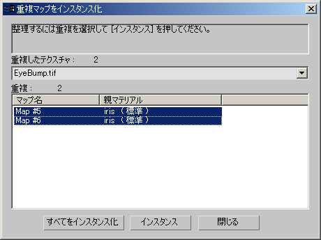 このダイアログ ボックスには、シーン内でまったく同じ重複を持っているテクスチャ マップが一覧表示されます。同一のパスと設定を持っているすべてのコピーが検索されます。