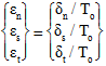 ここで、tn、ts、tt は 3 方向の表面力です。対応する方向の基準ひずみは n、εs、εt です。基準ひずみは、粘性要素の基準厚さ To (初期厚さとも呼ばれます)を使用した 3 つの分離(δ)と関連しています。