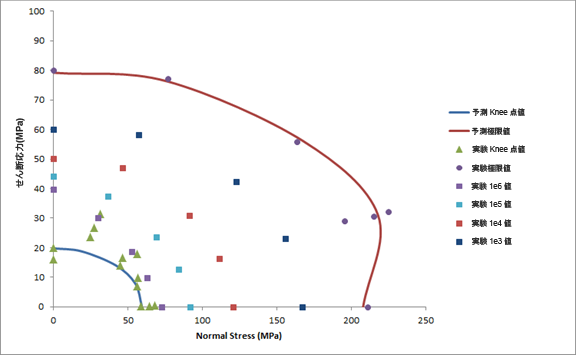 A i の値は、縦方向引張、縦方向圧縮、面内せん断の 3 つの複合材料の静的破損テストから決定されます。方程式 47 に示す破損基準は、実験データと次に示す Predicted Ultimate というラベルの付いた結果に対して検証されました。