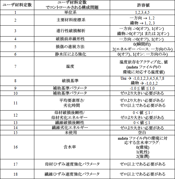 ユーザ材料定数セットは、*USER MATERIAL キーワード ステートメントの直後に続くデータ行に入力されます。Simulation Composite Analysis ユーザ定義材料サブルーチンはこれらの定数を使用して、複合材料に使用されるマルチスケール構成関係の正確なフォームを決定します。どのタイプの材料でも、ユーザ材料定数の数は、3~18 の範囲内である必要があります。次の表は各定数値の許容範囲と、各ユーザ材料定数によってコントロールされる機能を簡単に説明します。