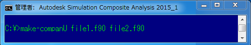 適切な環境が設定されると、ユーザ サブルーチン ライブラリをコンパイルして、Simulation Composite Analysis とともにインストールされたバッチ ファイルを使用してリンクさせることができます。このバッチ ファイルは make-companU.bat という名前で、Simulation Composite Analysis コマンド シェルを開いてアクセスできます。目的のソース コードが格納されるフォルダからこのバッチ ファイルを実行して、そのバッチ ファイルに対して各 Fortran ソース ファイルを引数として送信します。たとえば、ユーザ サブルーチンが file1.f90 および file2.f90 ファイルに含まれている場合、ライブラリを作成するコマンドは次に示すとおりです。