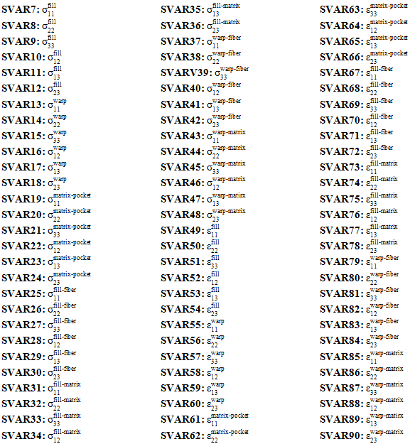 織物複合材料を使用した進行性疲労解析の場合、SVAR11~SVAR94 は、さまざまなスーパー構成および構成の平均の応力状態とひずみ状態の個別の成分を格納するために使用します(静的解析の SVAR7~SVAR90 と同等)。