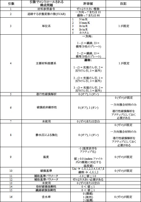 )がすべて元の損傷していない繊維構成係数の 1% にまで低減することを指定します。繊維破損後剛性値は 0 (ゼロ)より大きく、1 以下である必要があります。15 番目の引数が指定されていない場合は、1E-06 の既定値が仮定されます。