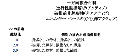 SV2 (MAT_STATE とよく名前を変更される)は、複合材料の個別の損傷状態を表す実変数です。これは 1~3 の間の離散値の有限数と仮定されます。SV2 によって仮定される離散値の数と離散値の解釈は、複合材料タイプ(一方向または織物)、および材料の応答を説明するために使用する材料の特定の非線形性機能セットによって異なります。次の表は、使用可能な複合材料タイプと材料の非線形性機能セットの各組み合わせに対する SV2 の各許容離散値の解釈を示します。