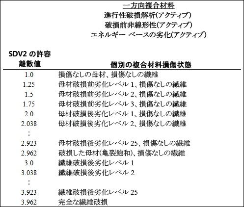 - SV3 は指定された荷重増分に付随するサイクル数です。繊維が破損した場合(SV2=3.0)を除き、この値は常に更新されます。破損した場合は、繊維破損時の値が破損サイクル数に設定されます。